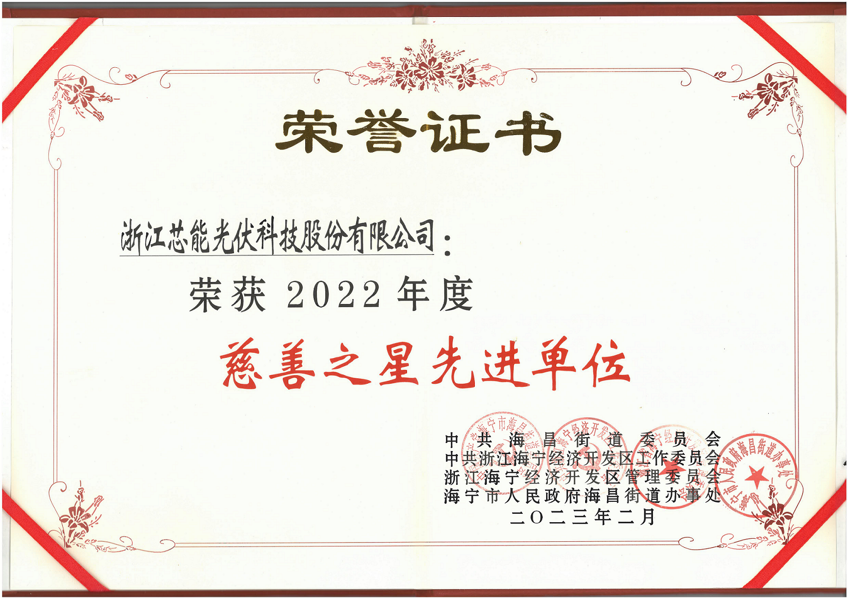 2023年2月8日,在海宁经济开发区、海昌街道“以最优营商环境 赋能高质量发展”2023年度经济工作大会上,芯能科技荣获2022年度明星企业和慈善之星先进单位。