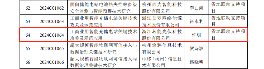 此外,在浙江省科学技术厅公布的《2024年度“尖兵领雁+X”研发攻关计划第一批立项项目清单》,由芯能科技牵头申报的《工商业用智能光储电站关键技术攻关及示范应用》成功入选“尖兵”计划项目。